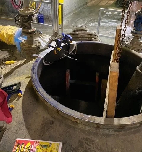 Here is the installed repair. The small plug indicates where the cement was injected to fill all the void under the patch. The perimeter is sealed to less than .001”. The replacement gasket must be shimmed and sealed to prevent leakage.
